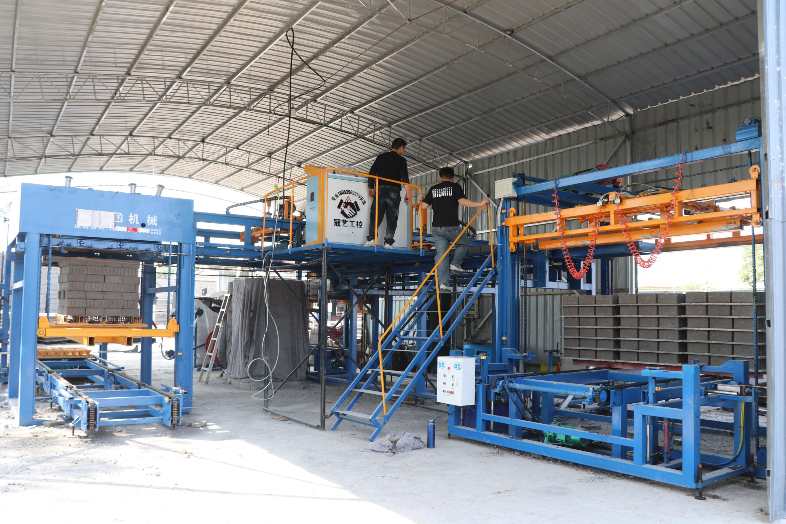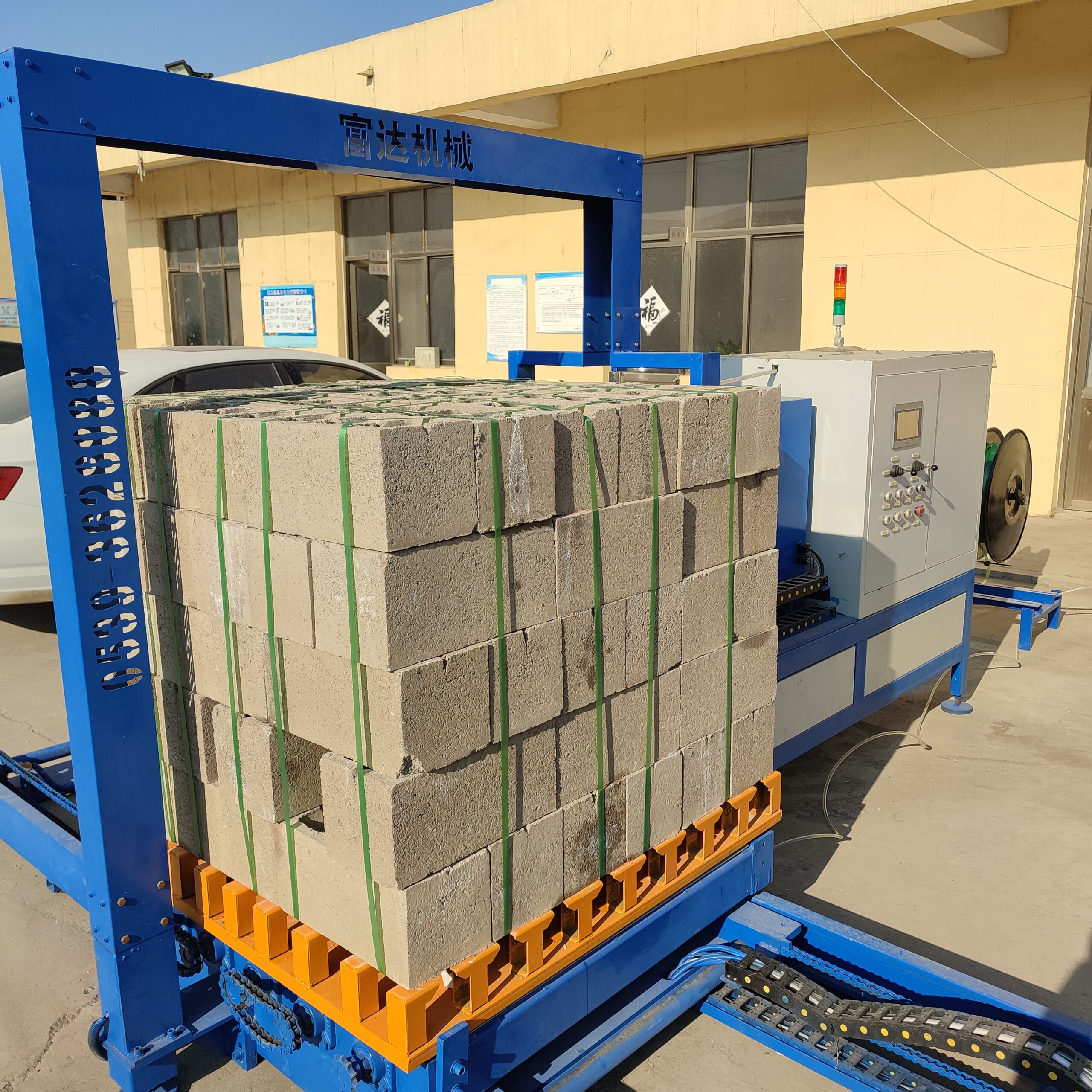 The fully automatic brick stacking machine is a highly automated machine designed to safely and efficiently sort, transport, and stack cured cement bricks into neat piles.