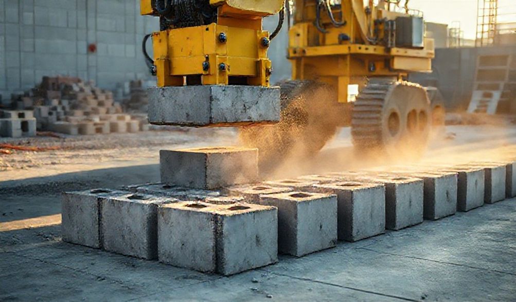 - Deposition: The mold carriage lowers, and the block is ejected onto the prepared curing floor. The mold returns to its starting position, leaving behind a perfectly formed block, ready for curing.